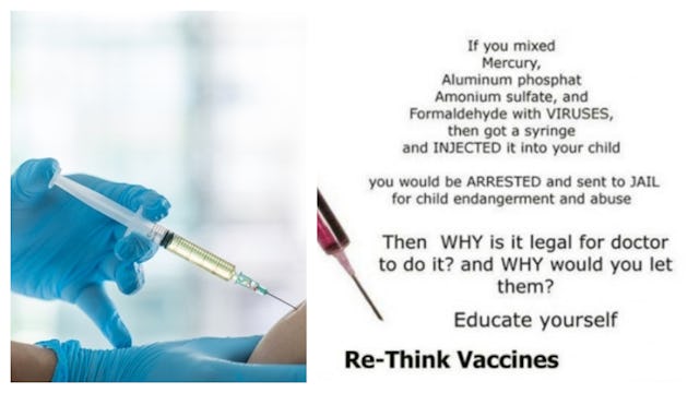 It all started when an anti-vaxxer posted a meme that read: “If you mixed mercury, aluminum phosphate, ammonium sulfate, and formaldehyde with VIRUSES then got a syringe and INJECTED it into your child you would be ARRESTED and sent to JAIL for child endangerment and abuse. Then WHY is it legal for [a] doctor to do it? And WHY would you let them? Educate yourself. Re-think vaccines.”