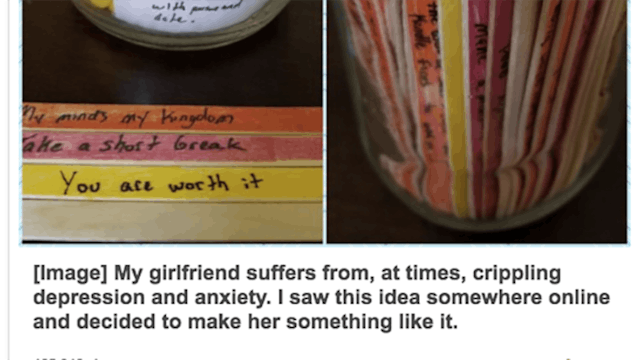 The comments are full of people who are either in a relationship with someone who suffers from depression and anxiety, or have the illnesses themselves. Many want to recreate the jar for their own loved one, hoping it might give them a little support when they can’t be there. And plenty say this kind of gift would be much-appreciated from a loved one.