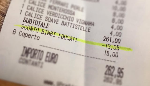 Antonio Ferrari, the owner of a wine bar in Padua, Italy, whose restaurant offers family meals on Sundays, first gave a 5% discount to a family whose children were sitting at the table “with much composure.” Ferrari has since given the discount to two other families. In an interview with The Guardian, Ferrari (who doesn’t have children) said that while he can “imagine how difficult parenting is today,” he estimated that about 30% of the parents who dine at his restaurant have children who badly misbehave, and he is so appreciative of those with polite children that he wanted to thank them. As he wrote under this picture of a discounted bill, “It’s just so unusual!”