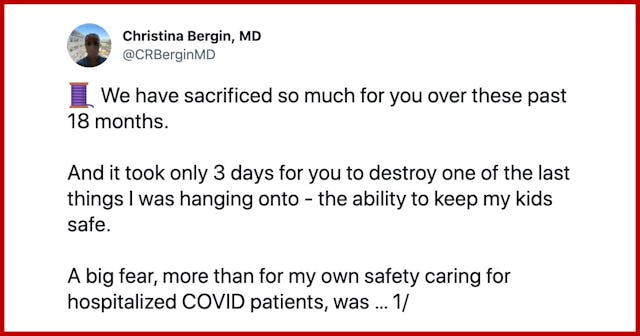 “I’m furious,” Bergin (rightfully) says. “I’m deeply disappointed at how many care so little for others in their community, for their kids’ friends & family members & teachers. That they care so little for the healthcare workers who have been beaten down over & over again for the past 18 months, but are picking themselves up to meet the monster yet again.”