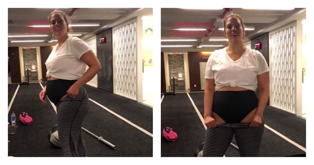 In the video, she pulls her workout pants down, showing off the fact that her pants don’t even come close to covering her growing bump. “This is my underwear,” she continues, explaining that it “hurts” when her leggings hit her belly in the wrong spot. “This is not okay,” she says, also pointing out that wearing them down below her bump, where it actually feels “okay” makes her butt look weird.