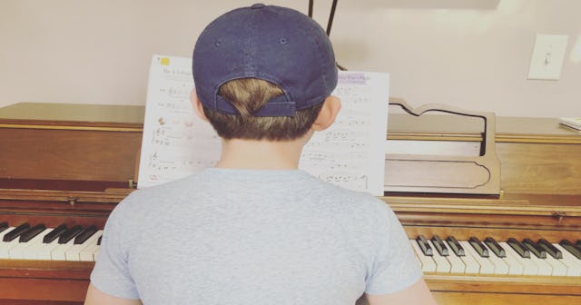 My son sat down at the piano this morning in his PJ pants, bare feet, and a baseball cap, and he played his heart out. Because he does so every day now. And because he LOVES it.