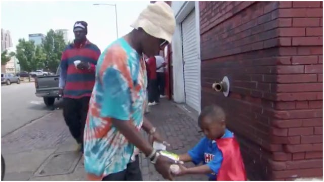 As soon as Perine realized that people who were homeless and hungry in his city, he decided he needed to step up to the plate. He asked his parents to take any money they would have spent on allowance and toys, and instead buy bags of food that he can distribute to those in need. So, already this kid is literally a shining star and pint-sized humanitarian. Then, he went and turned himself into a superhero. Bright red cape and all.