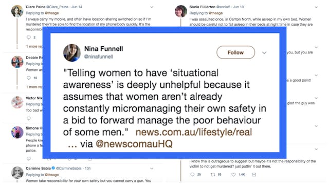 Last week, Australian comedian Eurydice Dixon was heading home after a gig when she was raped and murdered. Police officers responded by releasing a statement that urged people walking at night to “take responsibility for their safety.” Australian women and women across the internet quickly sounded off on those words of advice, explaining that they were packed with victim blaming and ignorance.