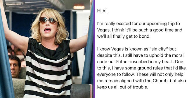 Okay, deep breath and let’s begin. First off: the woman acknowledged that the group was headed to Las Vegas, aka “sin city,” but there would be zero sinning happening on the trip. “I have some ground rules that I’d like everyone to follow,” she wrote. “These will not only help me remain aligned with the Church, but also keep us all out of trouble.”