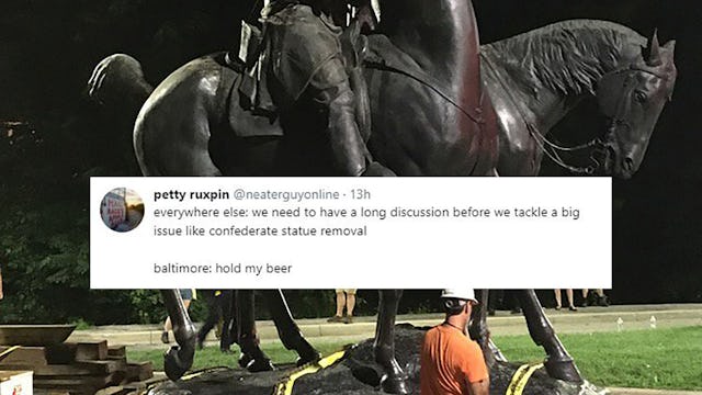 Leave it to a woman to get that shit done. Can we erect a statue of Mayor Pugh please and thanks? The city of Baltimore seemed to have overall positive reactions on Twitter, with many people documenting the historic removals all over town.