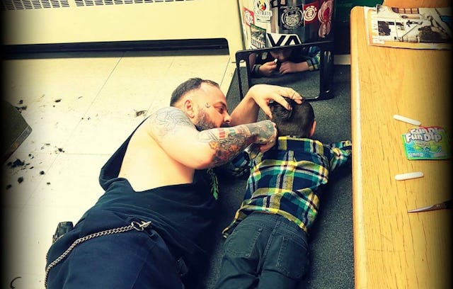 Six-year-old Wyatt and his mom, Fauve Lafreniere, started going to Jakob’s shop, Authentischen Barbier in Quebec two years ago. “At first I didn’t know he was a barber, so I talked to him about my son,” Lafreniere tells Scary Mommy. “And he just told me ‘bring your boy to my shop, I’ll do his hair.'” She said once she realized he was a barber, “that was the beginning of that” and two years later, Wyatt is still going to see Jakob.