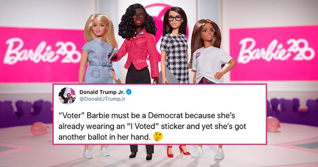 “‘Voter’ Barbie must be a Democrat because she’s already wearing an ‘I Voted’ sticker and yet she’s got another ballot in her hand,” he tweeted Wednesday, alluding to his father’s accusations about voter fraud. You know, those claims Trump has been making that mail-in ballots cause an increase in voter fraud — when they actually don’t.
