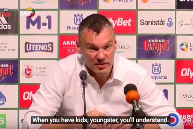 Jasikevicius: “Do you have kids? When you have kids, youngster, you’ll understand. Because that’s the height of human experience. Wow, that’s a good question really. Do you think basketball is the most important thing in life?”