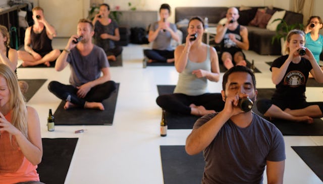 But if you drink beer, you know that pleasant feeling when you’re half a bottle deep and start to mellow out. Now, imagine combining that chilled out vibe with a little downward dogging where you’re too buzzed to worry about mooning the row of enviably bendy chicks behind you?