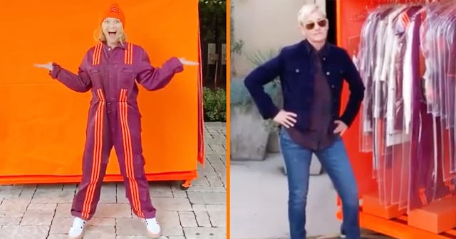 “How do you top this one? I have to send something to Beyoncé,” Ellen quips when she sees the behemoth rolling box. And honestly, imagine trying to impress BEYONCE. “The hell… ?” she mutters as she opens it. And there it is — a whole rack of gender-neutral activewear. “I haven’t looked at everything yet but these pants are my favorite,” says Ellen as she plucks through the offerings.