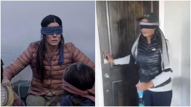 If you haven’t seen the Netflix hit Bird Box yet, what are you waiting for? It’s an edge-your-seat thriller about surviving an apocalyptic “being” that, when you look at it, takes the form of your worst fear causing you to take your own life. To combat this, Sandra Bullock’s character makes her fam wear blindfolds in order to survive. Naturally, this means randoms are also trying to get around wearing blindfolds as they go about their daily life and…yeah…it’s not working out so well.