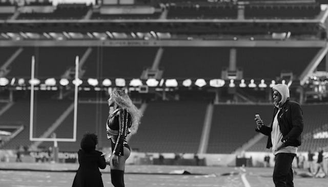 First, there’s Blue and Jay-Z hanging out with Beyonce while she practices her choreography on the field. Blue is decked out in a long coat and standing next to her mom as her dad snaps photos of them on his phone — you know, just your typical family photo full of iconic superstars.