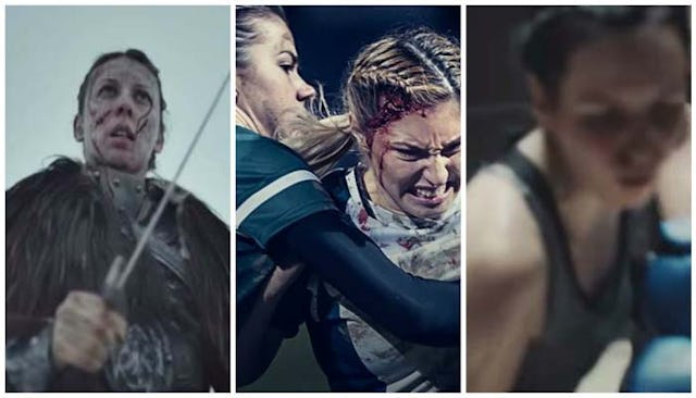The ad shows women engaging in different ass-kicking athletic pursuits. We see them pushing their physical boundaries to the limit, to the point where it makes them bleed. There’s the ballerina with the smashed, bloody toes, the runner who falls, scraps her knee and gets back up again, the rugby team sprinting down the field, the boxer, her hands wrapped in gloves, the surfer making a mad dash into the ocean. These women are powerful, fierce, determined, unrelenting…and bleeding.