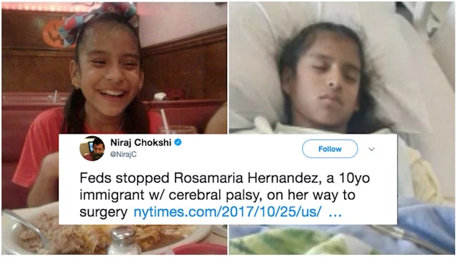 Currently, Rosamaria is under the jurisdiction of the US Department of Health and Human Services until a custody determination has been made by an immigration judge, according to The Guardian. She is reportedly receiving adequate medical care, but she is without her mother and could be for several weeks. Her mother, Felipa Delacruz, who also lacks legal immigration status, is in Laredo. Can you imagine how terrifying this must be for her and her young daughter?