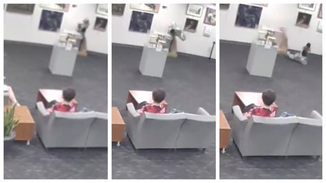 But, here’s the thing. If you have an expensive piece of art you’re responsible for safe keeping, why would you display it without a rope or something sectioning it off from the public? It’s clear from the video it’s fairly easy to knock over and knowing you have both adults and children who will visit, it seems like some responsibility lies with them to protect their investment.