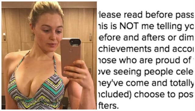 Since 26-year-old model and body positive advocate Iskra Lawrence has first-hand experience with eating and weight loss issues she joined the movement and posted a photo of her own. “Since I’ve come out about my struggles, it’s amazing how many girls from my past have said, ‘Do you realize I felt the same as you, Iskra?’ How crazy that we all did and yet none of us talked to each other about it,” she told SELF.