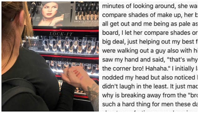 Sephora’s one of those stores that some boyfriends and husbands refuse to even set foot in, lest another dude sees them standing too close to the bronzers. Not only did he go with his girlfriend to check out some products, he also stepped up as her swatching model. “Today me and my girlfriend went into Sephora. I gave the classic sigh followed by a monotone, “Whatever you want babe,'” he begins. “After a couple minutes looking around, she wanted to compare shades of makeup, her being tan as all get out and me being pale as a white ass board, I let her compare shades on my hand, no big deal, just helping out my best friend.”