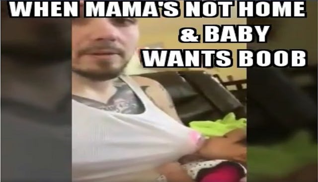 More power to this dad. I’d love to see him take this show on the road and whip out his chest-bottle rig at a restaurant, or somewhere else out in public. Maybe he’d get a taste of what many women have to deal with when someone witnesses the horror of public breastfeeding. Except he’s a man, so he’d not only get a pass, he’d get praised, and probably high-fived for doing what is essentially the bare minimum: feeding his child.
