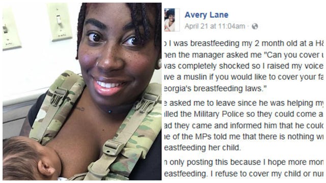 Lane was living on a military post and was visiting a local H&R Block location with a friend when the incident occurred. She posted about what happened on her Facebook page, saying, “So I was breastfeeding my 2 month old at a H&R Block on a military post when the manager asked me “Can you cover up with a towel or something?” Lane writes. “I was completely shocked so I raised my voice slightly and said ‘No but I have a muslin if you would like to cover your face. You must not know Georgia’s breastfeeding laws.’”