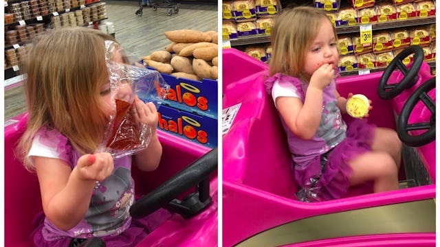 I take this adorable little handful to the store each Saturday. We get the pink car cart because that’s the one she insists on. Not the black car cart or the blue car cart — that would get me killed.