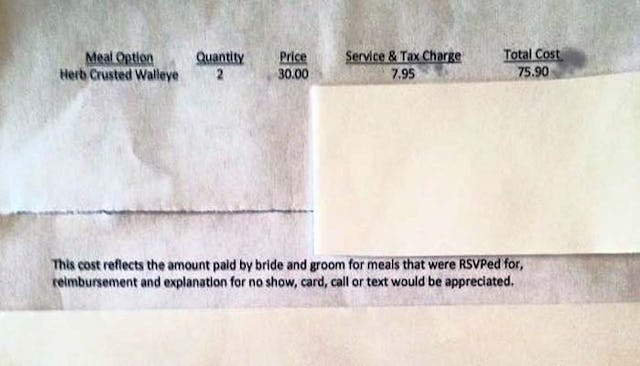This cost reflects the amount paid by bride and groom for meals that were RSVPed for, reimbursement and explanation for no show, card, call or text would be appreciated.