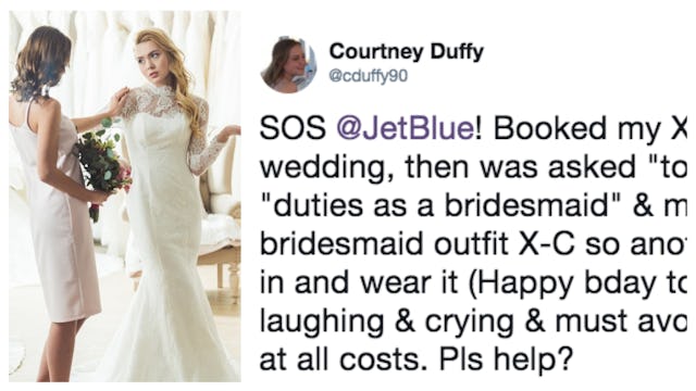 “SOS JetBlue! Booked my X-C flights for a wedding, then was asked ‘to relinquish’ my ‘duties as a bridesmaid’ & mail my bridesmaid outfit X-C so another girl could fill in and wear it (Happy bday to me!),” she wrote. “I am laughing & crying & must avoid this wedding at all costs. Pls help?”