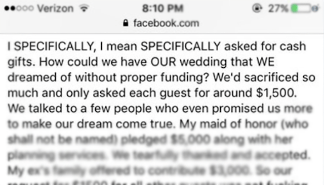 Twitter user @0lspicykeychain gifted us all with this train wreck of a story, and posted screenshots from a very real Facebook status found in a “wedding shaming” group (did not know that was a thing, would like to join immediately).