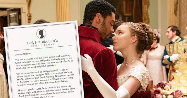 “The ton are abuzz with the latest gossip, and so it is my honor to impart to you: Bridgerton shall officially return for a second season. I do hope you have stored a bottle of ratafia for this most delightful occasion,” the notice reads.