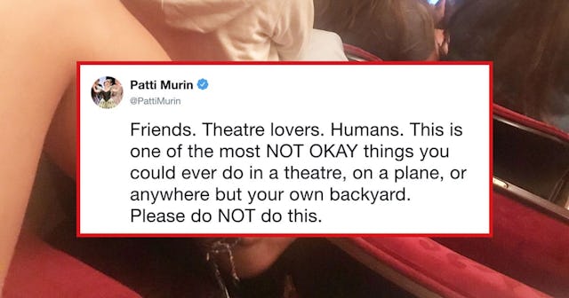 “Friends. Theatre lovers. Humans. This is one of the most NOT OKAY things you could ever do in a theatre, on a plane, or anywhere but your own backyard. Please do NOT do this,” Murin tweeted.