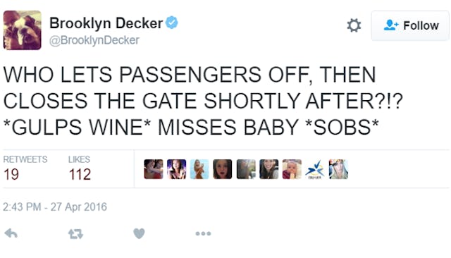 Flying with a baby can be a total pain in the ass, but it turns out that flying without them might be worse. Actress and model Brooklyn Decker found that out the hard way on her first flight without her baby, and she live tweeted every annoying moment.