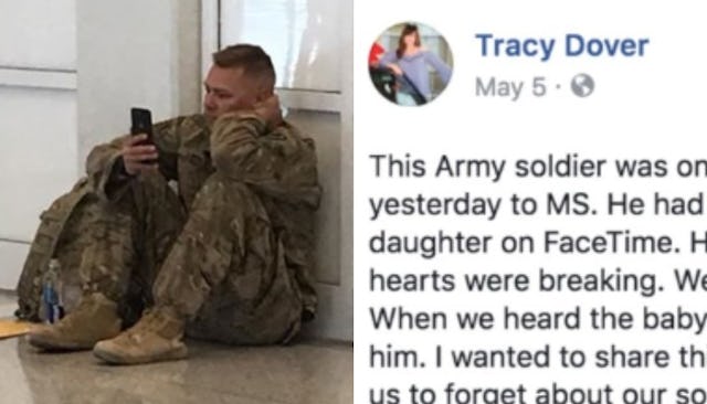 Tracy Dover was waiting to board a flight when she happened across a heartbreakingly poignant scene: A soldier, Brooks Lindsey, sat on the floor, watching the birth of his new baby daughter on FaceTime. She snapped a photo and posted it to Facebook, where it was also shared by Frank Somerville, a popular news anchor at KTVU. The image has since gone viral, and the story behind it tells us exactly why.
