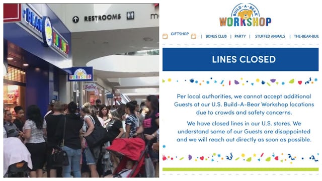 “Per local authorities, we cannot accept additional Guests at our locations due to crowds and safety concerns,” Build-A-Bear said in a statement. “We have closed lines in our U.S. and Canada stores. We understand some Guests are disappointed and we will reach out directly as soon as possible.”