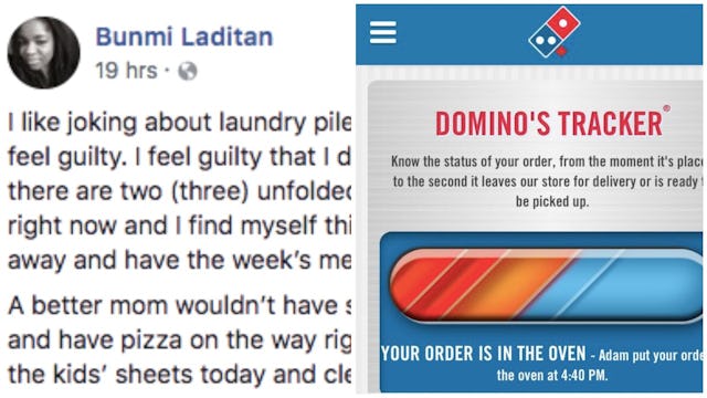 Laditan explains how she feels like “a better mom” wouldn’t stoop to ordering pizza with a house full of newly-purchased groceries, and the guilt she feels in not cooking sometimes or putting away laundry and all the other tasks that go into maintaining a household.