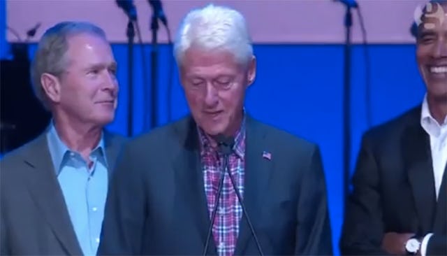 There are two parts to the “Dad Joke.” Part one is the actual telling of the terrible joke. Part two is the anxious anticipation of the response to said joke. Anyone who has a partner or father who tells terrible jokes knows this. That’s why this clip of George Bush telling a joke to Barack Obama during Bill Clinton’s speech at Saturday night’s “Deep From the Heart: The One America Appeal” event is going so viral right now.