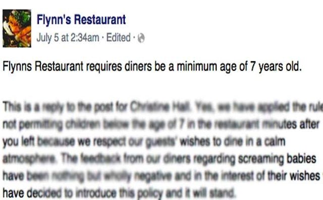 If all parents responded to screaming children the same in restaurants, this wouldn’t even be an issue. But they don’t. This is a debate that people will probably never agree on. Flynn has the right to ban children from his restaurant and customers have the right to not spend money there if they think he’s an asshole for doing so. It seems like there are enough people who want a kid-free dining experience to make this a worthwhile business choice.