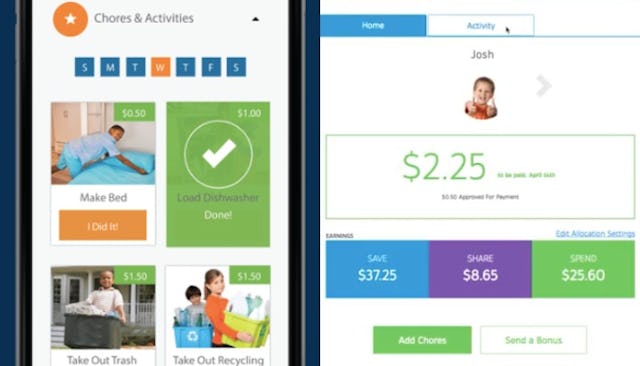 Within the app, parents can use their portal to add chores — everything from folding laundry to unloading the dishwasher to even bonus allowance payments for getting good grades — and the amount of allowance each chore is worth. Parents get to set when payday is, approve chores that kids have done and see when and where kids are using their money.