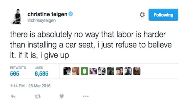 Chrissy Teigen posted a blunt tweet that sums up the feeling of installing a car seat for the first time: