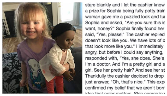 When neither of them could figure out what she was talking about, it became clear to Benner what the cashier was insinuating. “The woman gave me a puzzled look and turned to Sophia and asked, ‘Are you sure this is the doll you want, honey?’ She doesn’t look like you. We have lots of other dolls that look more like you,” Benner wrote.