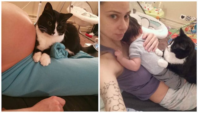 A cat spent her owner’s entire pregnancy cozied up to her belly and now that the baby’s here, she’s on guard 24/7