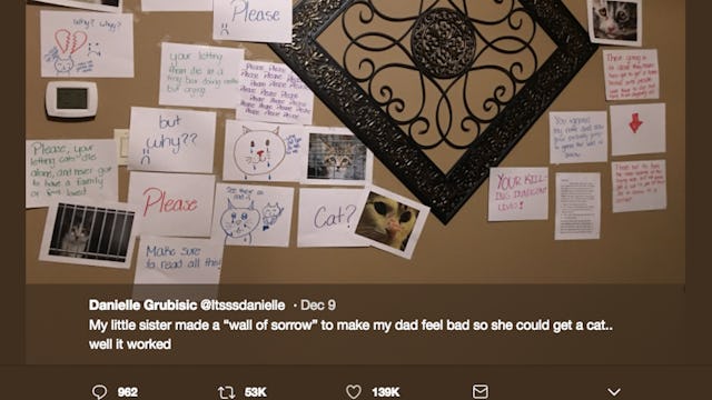 Danielle Grubisic tweeted a series of photos of her little sister’s “Wall of Sorrow,” the genius tactic she employed that involved covering a wall with photos of sad, unadopted cats and note cards with guilting statements about all the shelter cats who deserve a home like her family’s.