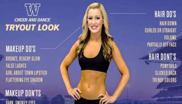 Having been the captain of my cheerleading squad in middle school, I am slightly familiar with the activity. And while a certain level of pageantry is encouraged (wear some blush on game day) it is ridiculous to list ways students should look. For example, false lashes. In between splits make sure your falsies are looking fresh and that your “girl about town” lipstick is the perfect shade. And don’t forget to achieve a “bronze, beachy glow.” How else will you land that backflip? The poster went up on the squad’s Facebook page last week but was deleted the next morning. “The graphic was removed immediately after a UW athletic department official saw it and determined that some of the details and descriptions provided were inconsistent with the values of the UW spirit program,” the school’s athletic department told People.