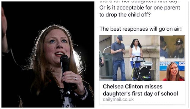 “SOUND OFF… Should Chelsea Clinton have been there for her daughters first day? Or is it acceptable for one parent to drop the child off?” What planet are we on? How many households have families where both parents can make it to school drop off? That’s not even really a thing. The whole purpose of this article and and subsequent coverage is to remind women that they are somehow going against nature by not being a mom first, all the time.