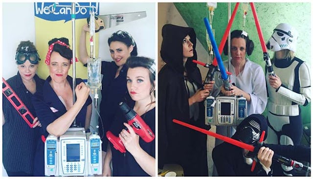 To create the whimsical pictures she drew inspiration from her favorite films and plays. Walsh’s infectious positivity has prompted friends, family, and even the medical staff at Weill Cornell Medical Center’s to dress up with her. “Everyone has been pretty excited about it,” she said. “There’s actually a sign-up sheet that’s usually a couple of months out. Some even ‘guiltily’ tell me they look forward to seeing the next photo, which I love.” They’ve covered “The Breakfast Club,” “Star Wars,” and “Rocky” among many more as Walsh nears her twenty-third chemo treatment.