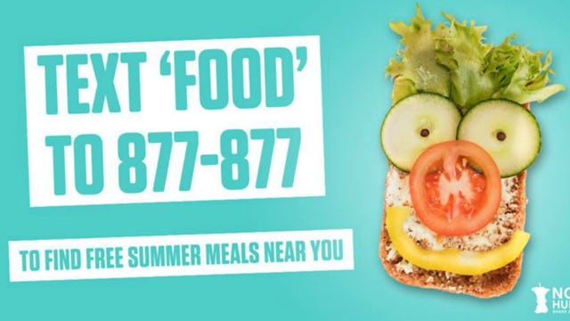 No Kid Hungry has set up a texting service so that all parent, teachers, friends, or neighbors have to do is text “FOOD”to 877-877, and they will automatically get a list of sites in their area that have free summer meals for kids in need.