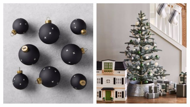 Or if your kids can understand keeping their paws off the branches, how about a new style for this year? Red and green are classic colors for the season, but we’re loving the sophistication of these black patterned and galvanized tree ornaments ($13 per set).