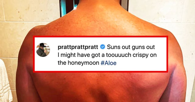 “Suns out guns out,” Pratt captioned a photo of his beet-red backside. “I might have got a toouuuch crispy on the honeymoon.”