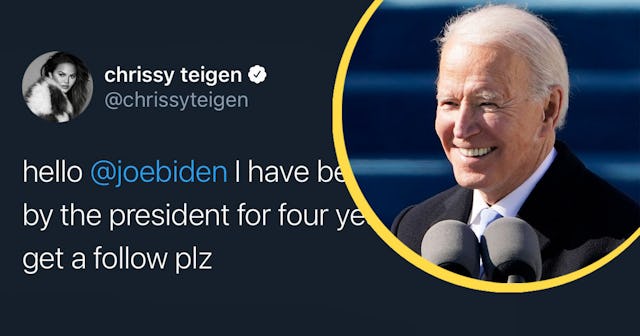 You guys, we’re back to having a cool president who jokes with famous folks and has an overall jovial disposition. I can hardly believe our luck after four years of misery, but it’s happening. President Biden wasted no time in having some fun with his POTUS Twitter account and that fun involved a jokey request from Teigen. “hello @joebiden I have been blocked by the president for four years can I get a follow plz.”