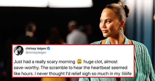 Our girl Chrissy Teigen is having a tough week. After being put on hospital bed rest due to “severe bleeding” while pregnant with her third child, the model/host/cookbook author has been keeping her fans updated with frequent social posts from her hospital bed and after getting a blood transfusion, Teigen took to Twitter to share about her “scary morning” dealing with a “huge” blood clot.