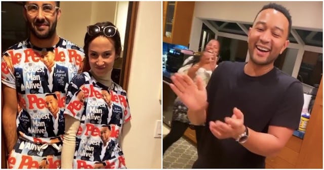 As most people know, this year People named John Legend “Sexiest Man Alive” for 2019. His pal on The Voice (and former SMA himself), Blake Shelton, delivered the good news via a pair of bedazzled shorts with EGOTSMA on the backside, spelling out his latest accomplishment — winning an Emmy, Grammy, Oscar, and Tony award — and now, a Sexiest Man Alive award. Though Shelton isn’t the only one getting in on the fun via clothing — Chrissy Teigen and some pals also surprised Legend over the weekend by wearing Legend’s People cover as pajamas.